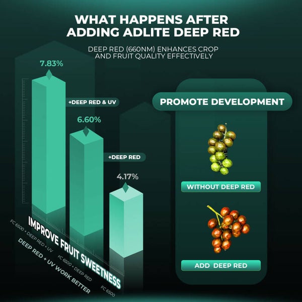Massimizza i raccolti con l'illuminazione Adlite completa: è fondamentale aggiungere luci supplementari UV IR rosso intenso per ottimizzare la crescita delle piante. Adlite IR30/UV55/Deep Red R55 sono consigliati per luci principali superiori a 500 W, come FC6500, FC-E6500, FC8000, and FC-E8000.