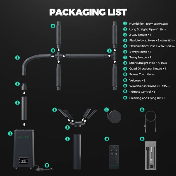 Il prodotto include: Umidificatore 15L x1, telecomando x1, sonda del sensore cablato x1, tubo lungo x1, tubo corto x4, tubo corto flessibile x4, tubo flessibile lungo x2, velcroes x3, ugello x4, kit utensile x1