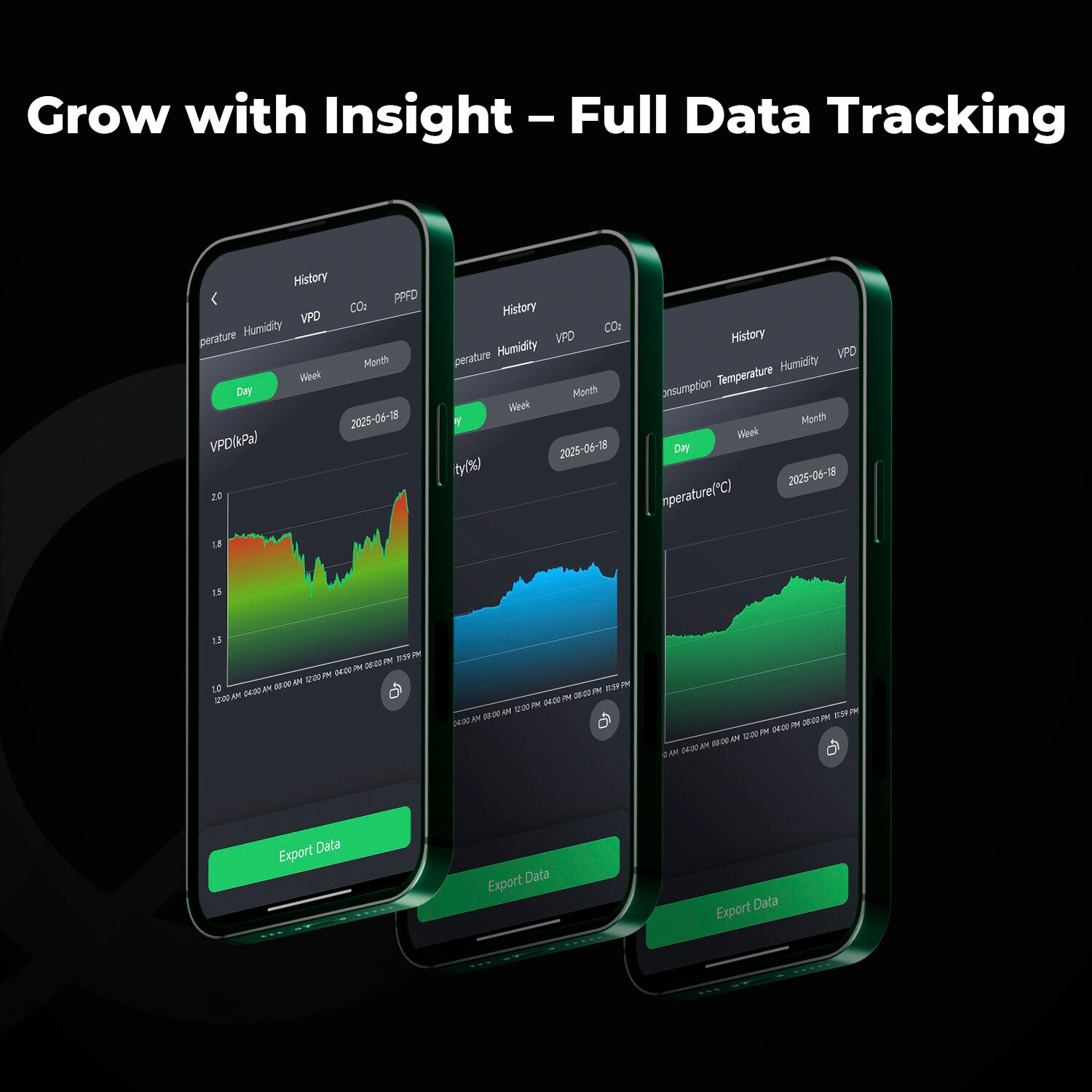 Regola automaticamente i dispositivi collegati in base ai dati in tempo reale di temperatura, umidità e VPD, mantenendo condizioni ottimali per la crescita delle piante.